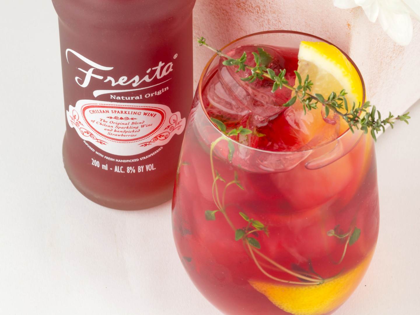 Käytä rohkeasti yrttejä drinkeissä! Raikkaassa mansikka-raparperidrinkissä tuoksuu timjami.