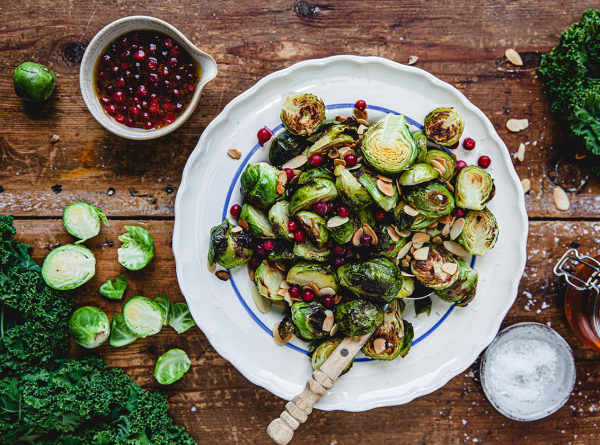 Uunissa paahdettua ruusukaalia paahdetuilla manteleilla ja puolukkakastikkeella