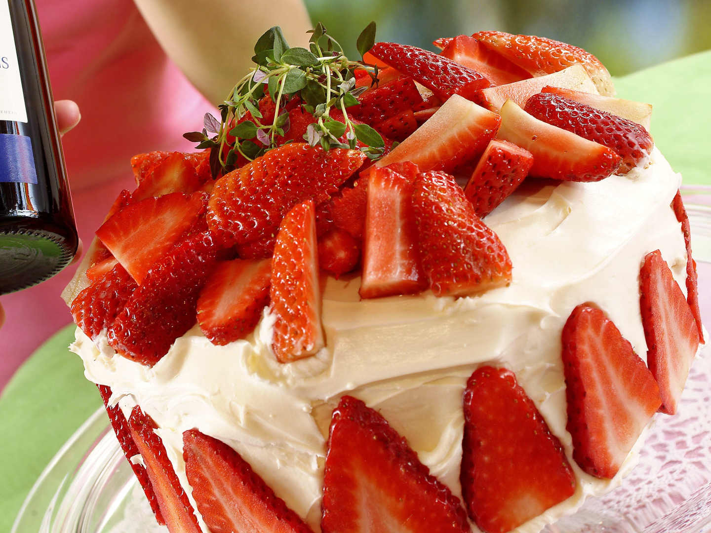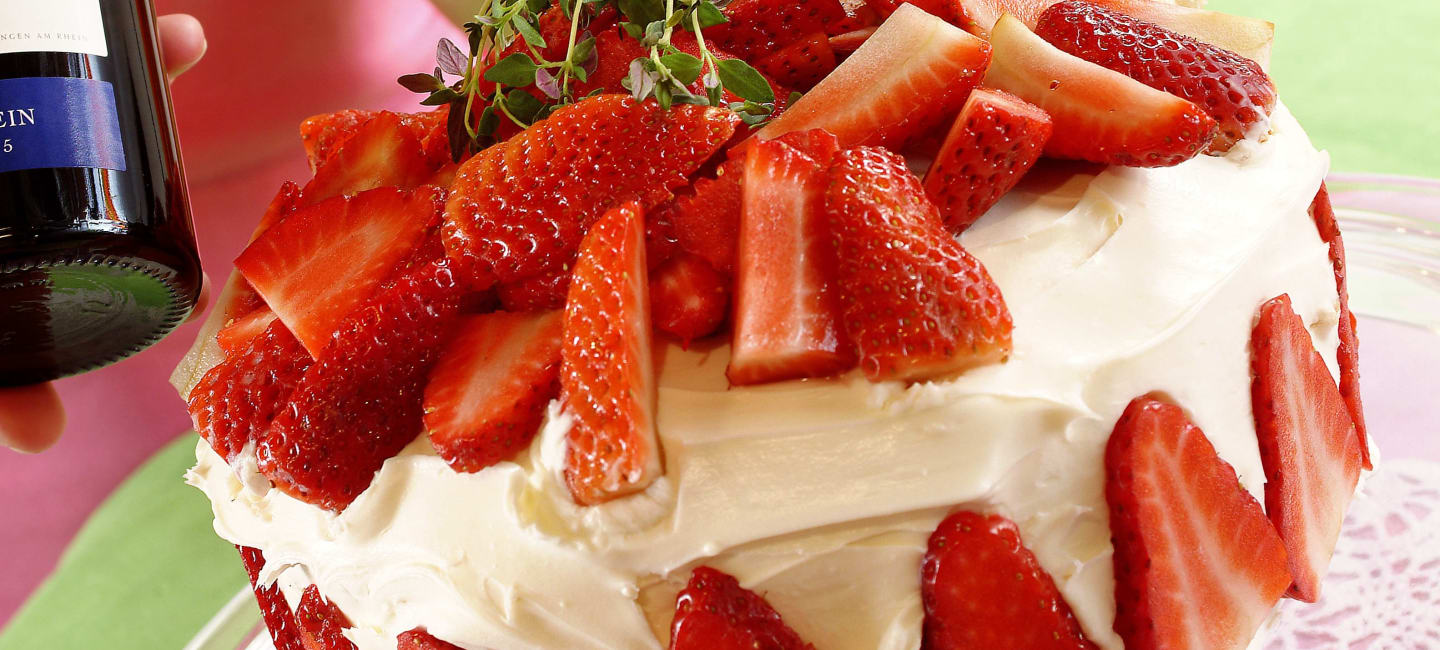 Herkullinen mansikka-mascarponekakku kostutetaan Fresita-kuohuviinillä.