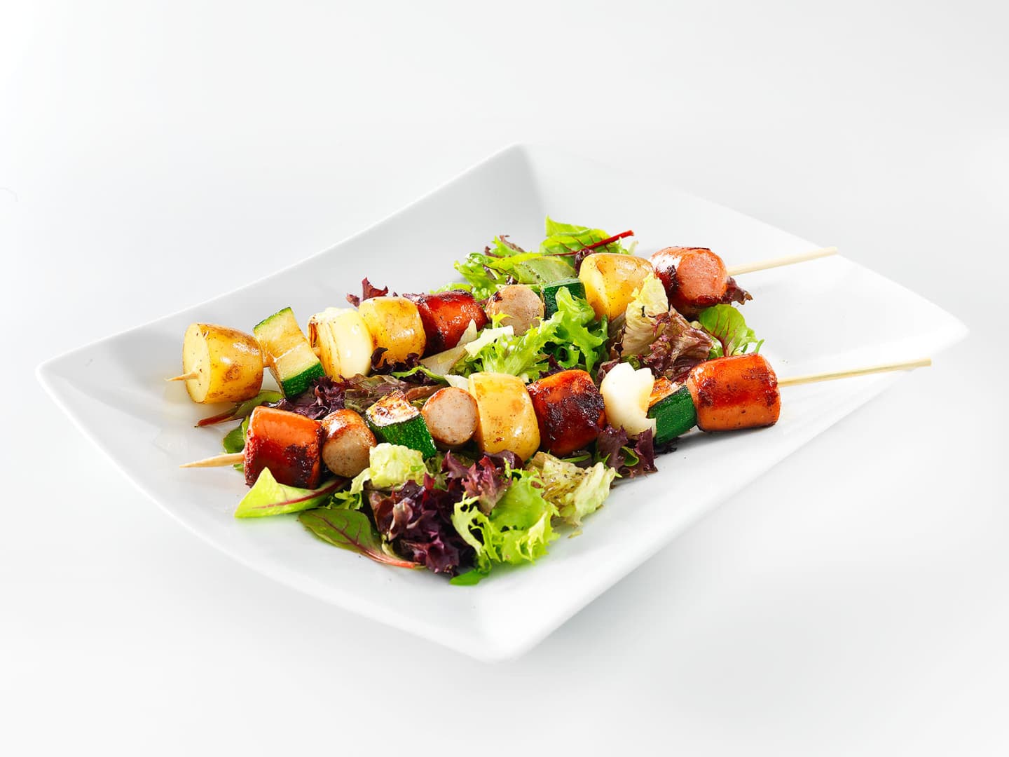 Ota grillitikut käyttöön (liota ensin puisia tikkuja vedessä, etteivät ne pala grillissä) ja pujota makkaroita, keitettyjä perunoita, kirsikkatomaatteja sekä kesäkurpitsaa vuorotellen tikkuun.