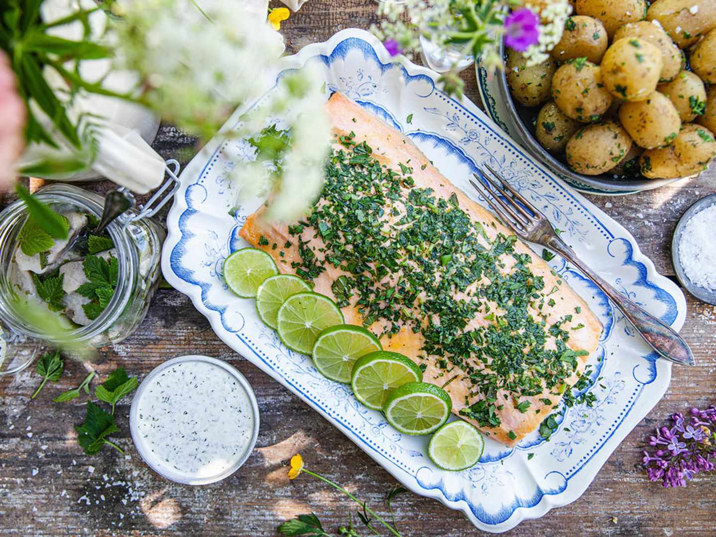 Hienonna tuoreet yrtit ja painele niitä lämpimän lohen pinnalle. Tarjoile joko lämpimänä tai kylmänä.