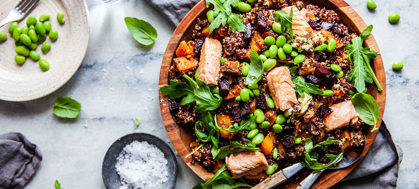 Sekoita keskenään kvinoa, pestomozzarella, pavut, rucola ja uunipaahdetut vihannekset.