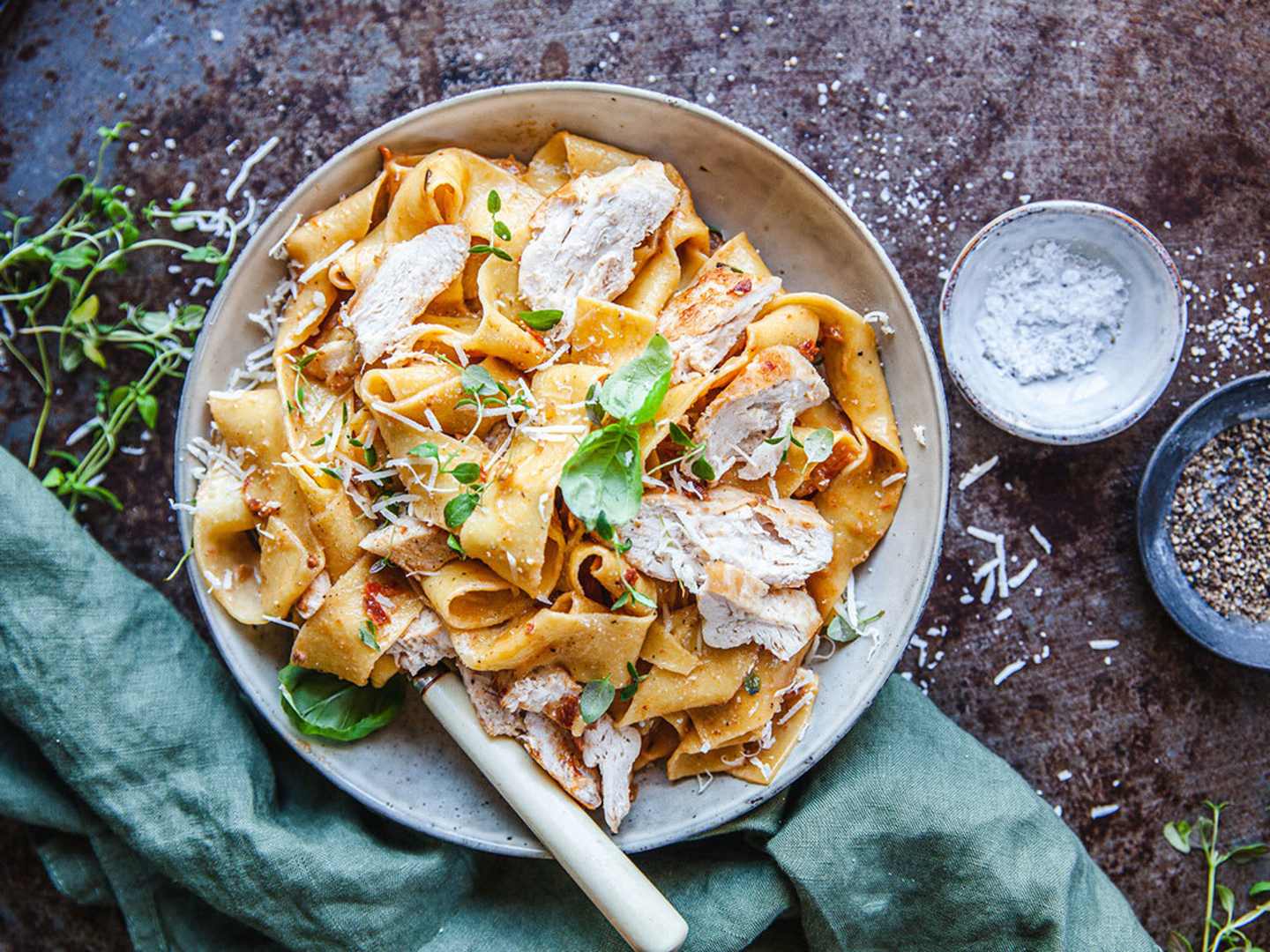 Pasta Alfredo resepti koostuu klassisesti vain kolmesta ainesosasta: fettuccine tai tagliatelle nauhapasta, kerma ja Parmesan-juusto. Tämä Pasta Alfredo on tuunattu ruokaisammaksi kanalla ja aurinkokuivatuilla tomaateilla.