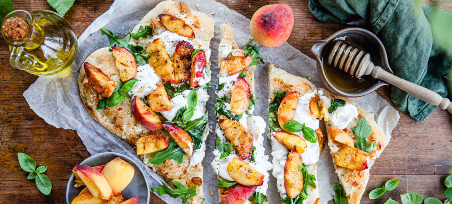 Jaa burrata, tuore basilika, rucola ja lämpimät nektariinit paistetun pinsan päälle.